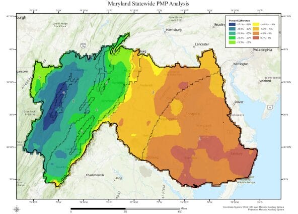 · PMP values retain a margin of safety. They remain suitable for underpinning inflow design floods (IDFs), dam safety reviews, emergency spillway evaluation, and flood-risk planning for critical infrastructure across Maryland.